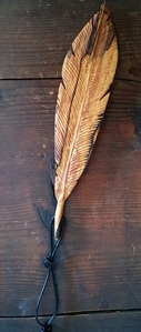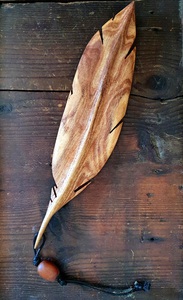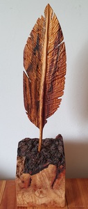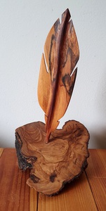 2021Deze veer is gemaakt van beukenhout met slaap ook wel houtschimmel genoemd. Door de schimmel,en de sporen krijgt het een prachtige tekening in het hout. Veer met sokkel